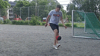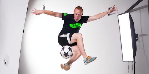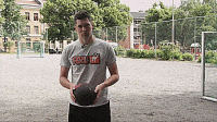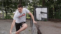 现在我们学会了如何从腿上跳跃,现在我们要将球放上去,我们要试着找到做剪刀脚停球的合适位置,然后继续练习上一步的跳跃。