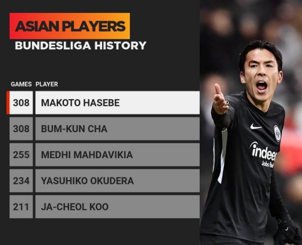长谷部诚追平车范根,目前两人并列亚洲球员在德甲登场第一位