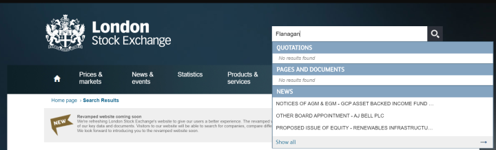 众所周知,英国公司如果想要在本国上市,那唯一的选择就是伦敦证交所。于是我打开伦敦证交所的首页,搜索“Flanagan”,发现根本就没有任何股票的名字里含有这个词。