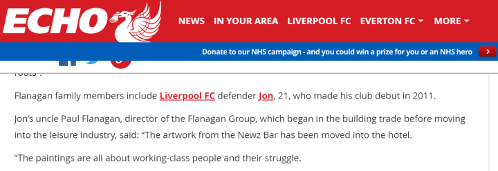 我耗尽了洪荒之力,终于在英文网络里找到了关于他和弗拉纳甘集团之间联系的一篇报道,还是来自《回声报》。那是一则弗拉纳甘集团向某酒店赠送了一幅油画的新闻,里面提到“家族成员包括利物浦后卫约翰-弗拉纳甘,他的叔叔保罗-弗拉纳甘是集团董事。”