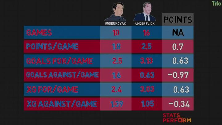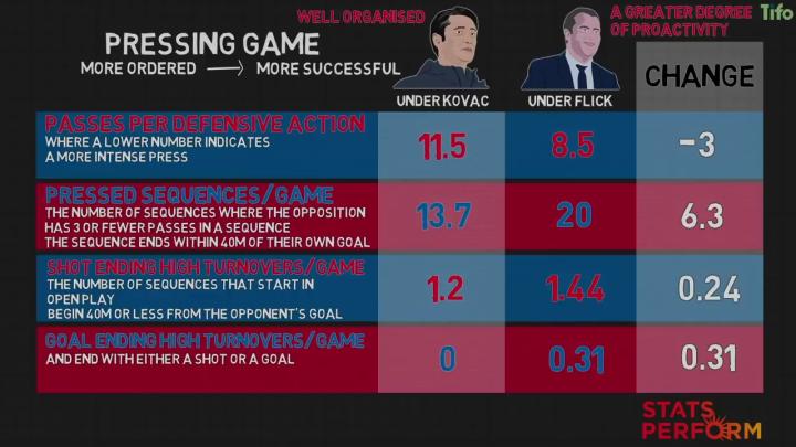 通过每一个关键的衡量标准可以看出,即每场比赛的得分、每场比赛的进球、每场比赛的预期进球,弗利克使拜仁变得更强。他还改进了拜仁的紧逼战术,使其更加有序,更加成功。这可以通过四个衡量指标看出: