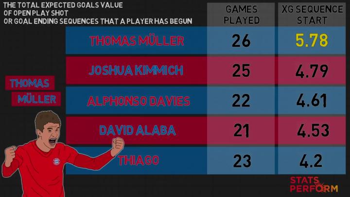 拜仁还有托马斯·穆勒,他仍然可以在莱万多夫斯基的身后以自己的方式进行破坏。穆勒的价值体现在他拥有拜仁球员中最高的预期进球值,他也是创造射门机会最多的球员。