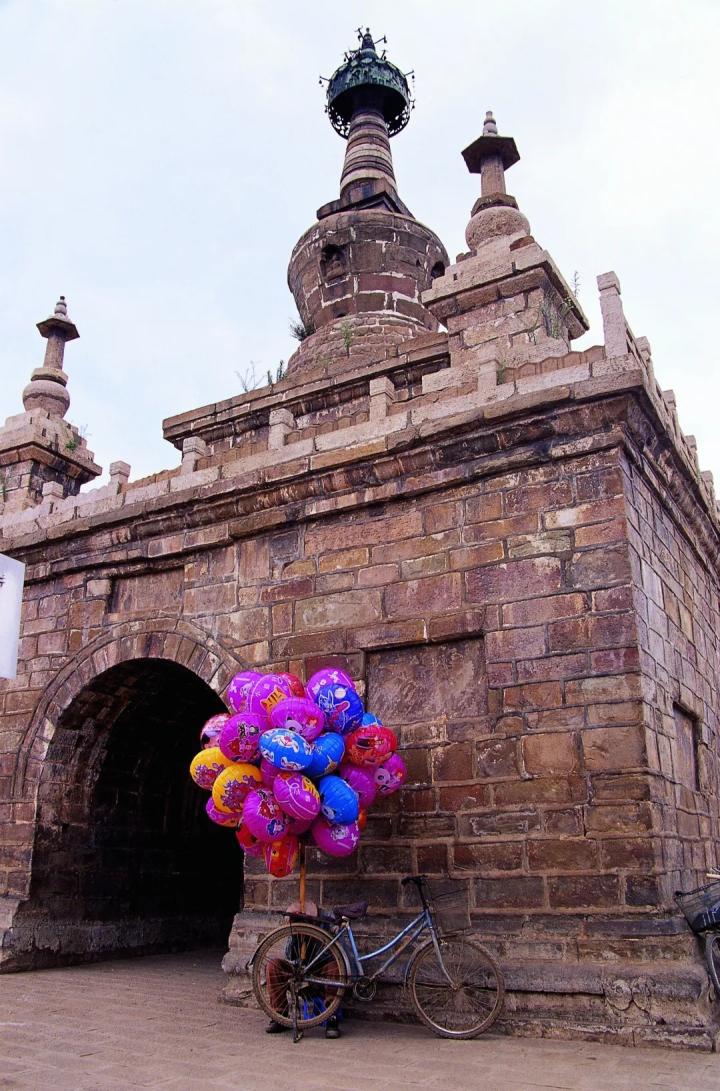 #金刚塔墙角,卖气球的人在打瞌睡。