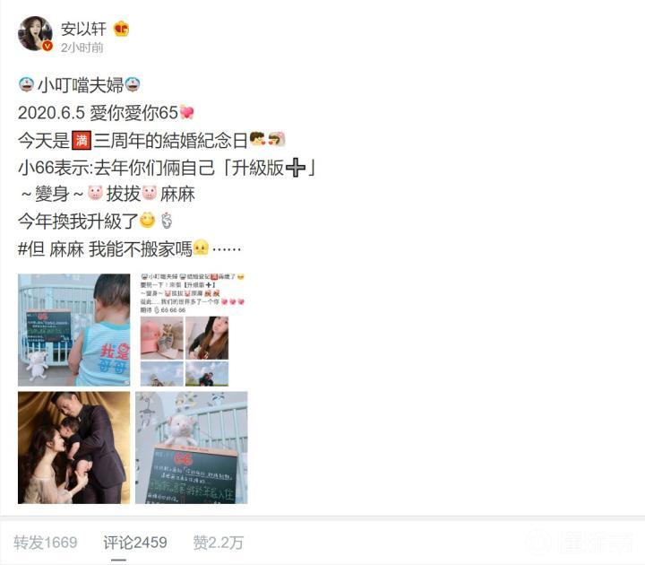 安以轩晒3周年结婚纪念,透露年底将迎来第2个宝宝可一禾 @懂球帝2020-06-05 15:28北京时间6月5日,演员安以轩在社交媒体上庆祝自己的三周年结婚纪念,并透露将在年底迎来第二个宝宝。图片来源:微博演员安以轩在社交媒体上写到:“今天是满三周年的结婚纪念日,小66表示,去年你们俩自己升级变身成拔拔麻麻,今年换我升级了。但,麻麻,我能不搬家吗?”在安以轩晒出的图片中可以看到:“新的‘房客’将于年底入住。”暗示将在年底迎来第二个宝宝。安以轩的社交媒体晒图图片来源:微博展开更多