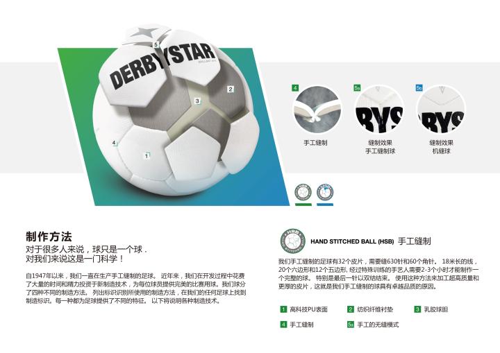 传统手缝足球有一个比较明显的标志,那就是非常有名的“C60”拼接面,即32块球面拼接,其中包括20块六边形和12块五边形。这种球面结构是Select创始人Eigil Nielsen的创新设计,让手缝足球拥有了最佳的圆度,至今Select和Derbystar依旧保持这种传统。于此同时,32块球面拼接也拥有更稳定的空气动力学,在足球飞行时更加的稳定,路线更好预测。当然,与其他品牌的科技化异形热粘合拼接球面相比,传统32块拼接在圆度和重量上已经没有了优势,但通过科技材质、精湛手工、专业认证配合之下,也让手缝足球拥有上乘的实战性能,比如Derbystar所使用的APS、TT绩效系统,代表了不同等级、不同性能的足球;再通过三级质量划分,再次细分品类。讲到这里,其实传统手缝足球的第一个优点已经出现了,这就是多拼接面打造的最佳圆度,以及其带来的稳定空气动力学,而两者相辅相成又能让这一性能保持的更持久,短期变形的几率大大降低。