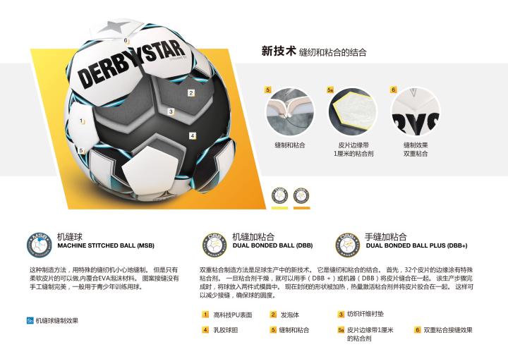 热粘合足球与手缝足球的区别其实比较明显,所以现在也延伸出了两者的合体产品,Hybrid混合拼接形式的足球。以Select旗下Derbystar的混合拼接足球为例,这款足球使用的是DBB+双针缝制技术,先将32块皮片边缘利用特殊粘合剂拼接,在通过DBB+(手缝)或者DBB(机缝)缝合,最后将球放入磨具之中加入,激活粘合剂。混合拼接形式之下,足球既能够提高防水效果,又能够提升使用耐久度。