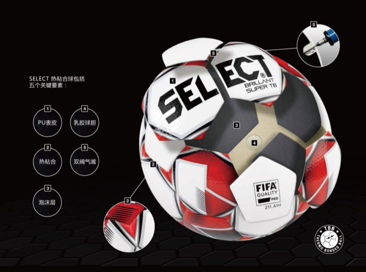 看到这里有EZer会问了,那究竟哪种拼接的足球更好踢?其实拼接形式并不影响我们实战时俗称的脚感。球好不好踢,取决于各种材料的使用。以Select和Derbystar的高端比赛球为例,球面的表层使用了带有高尔夫球纹理科技的PU皮块,触感柔软且耐久性很高。表层皮块之下是影响触感的发泡体层,它的柔韧性、厚度、耐久度都直接影响着足球的脚感;在往内是纺织纤维垫层,这一层会覆盖在足球内胆之上,起到定型和保护内胆的作用;最后是内胆,内胆的材质影响了足球的弹跳效果,Select和Derbystar等大品牌都会在高端球上使用天然乳胶,回弹性会比丁基乳胶更好,缺点是静置时间太久会泄气。所以使用天然乳胶内胆的足球在测试认证时,都会有固定静置时间后的气压检测。