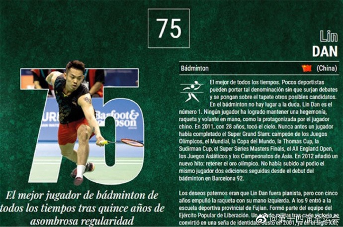 该评选的第71-100位结果已经公布,林丹最终位列75位,也是该区间唯一入选的中国运动员。《马卡报》评述称,林丹是羽毛球运动毫无争议的史上最佳。职业生涯至今,他已获得了2届奥运会和5届世锦赛的男单冠军。“超级丹”拿遍了羽坛所有赛事的冠军,没有哪位选手能像他那样称霸羽坛。