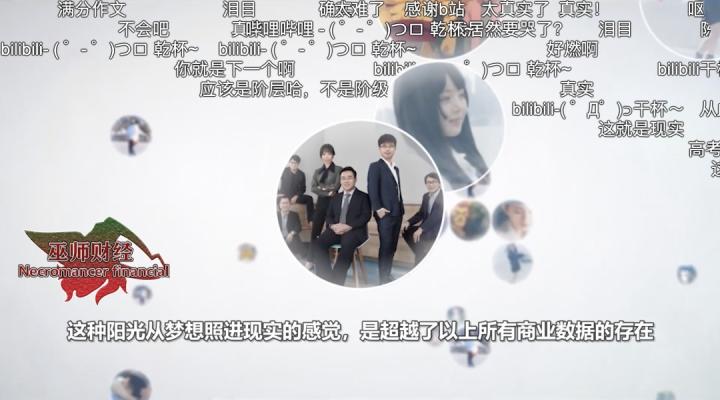 老蒋成为 UP 主的三个月后,巫师财经上传了一期关于 B 站财报的视频。在近十分钟投资角度的专业分析之后,巫师话锋一转,最终落在了个体实现阶层跃升的主题上。背景音乐随之倏尔切换到恢宏的交响乐,巫师从自己对 B 站知名 UP 主们的喜欢和欣赏,谈到当下阶级固化的种种现状,他说这个时代很难再看到白手起家的故事,但 B 站却给了创作者一个机会。