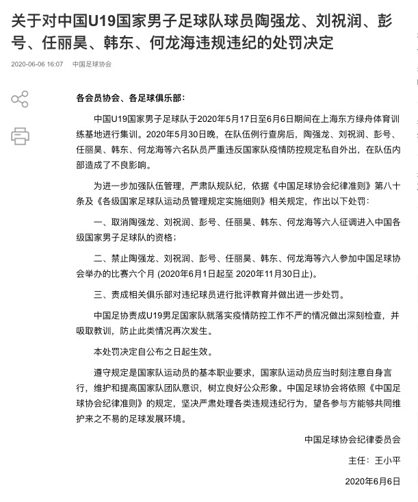 北京时间6月6日,中国足协官方针对陶强龙等6位U19国青球员集训期间外出饮酒一事做出了处罚,取消了陶强龙等六名球员征调进入各级国家队的资格,并禁赛6个月。