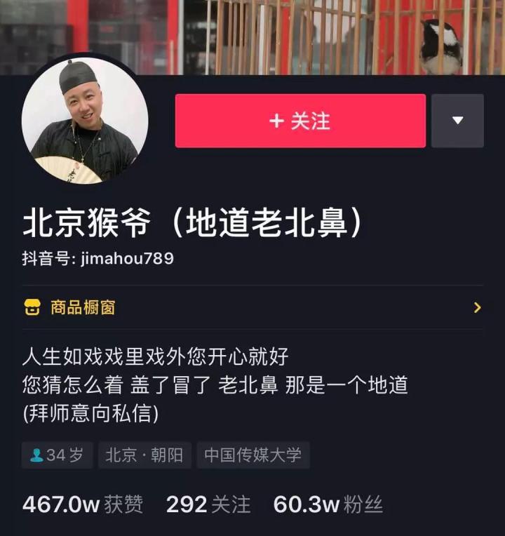 视频的主人公叫 “ 北京猴爷( 地道老北鼻 ) ” ,打开他的主页,几乎所有视频都有这样的特点。