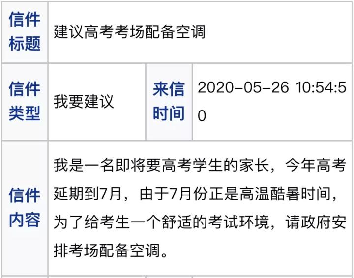 前段时间,有安徽合肥考生家长通过政务热线反映一个问题:7月份正是高温酷暑时间,为了给考生一个舒适的考试环境,请政府安排考场配备空调。