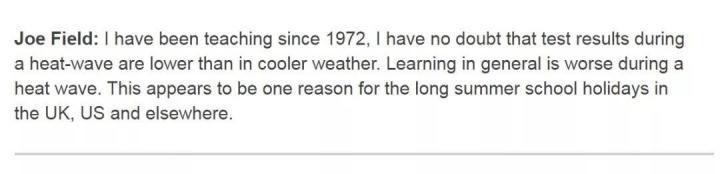 还有老师说,自己从1972年就开始教书,毫无疑问,高温期间考试成绩要低于凉爽天气的考试成绩。