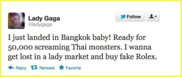 Lady Gaga一次泰国巡回期间在特推上表示,自己忙完后一定要在当地市场上狂扫一圈高仿劳力士。泰国官方随后表示抗议,称Lady Gaga公开场合大谈这种话题极大伤害了泰国人民的感情。