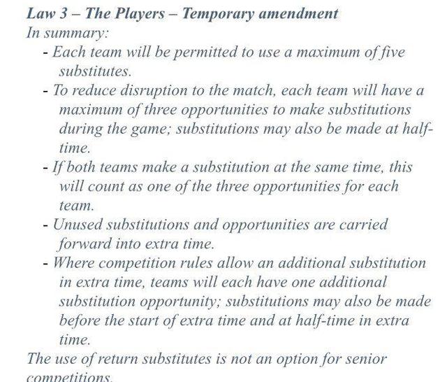 早在5月8号国际足联就已经宣布此消息,新规是临时的,只是针对2020年12月31日之前结束的比赛。