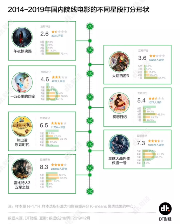 也有一些办法来排除掉那些标准差/争议性明显过大的电影。DT君参照“数据冰山”的方法,取各个分段聚类中心点作为该分段的标准分型。