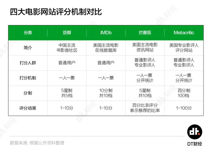 DT君整理了豆瓣、IMDb、烂番茄和Metacritic的评分机制。其中豆瓣和IMDb机制类似,为人熟知。Metacritic作为专业打分网站,会收集专业影评人分数、由影评内容换算评分,也因此在四个网站中最为严格。烂番茄的最终结果则比较特别,“新鲜度”并不是评分,而是按评分3.5分为界计算出的“推荐”和“不推荐”的比例,并不能真实说明影片质量。