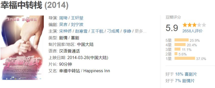 比如这部《幸福中转栈》,2658个人打分,但是只有43条短评和2条长评,且绝大多数为1星或2星,高达25.9%的5分率,参考意义怎么看都不是特别大。