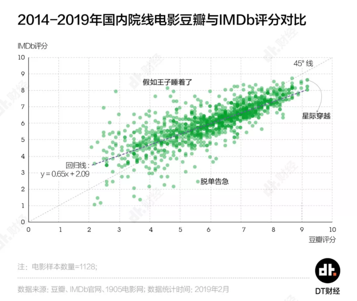 而大多数电影,在两家网站上的表现比较一致。在DT君选取的样本中,IMDb有44部电影评分在8分以上,这其中近7成在豆瓣也获得了8分好评。