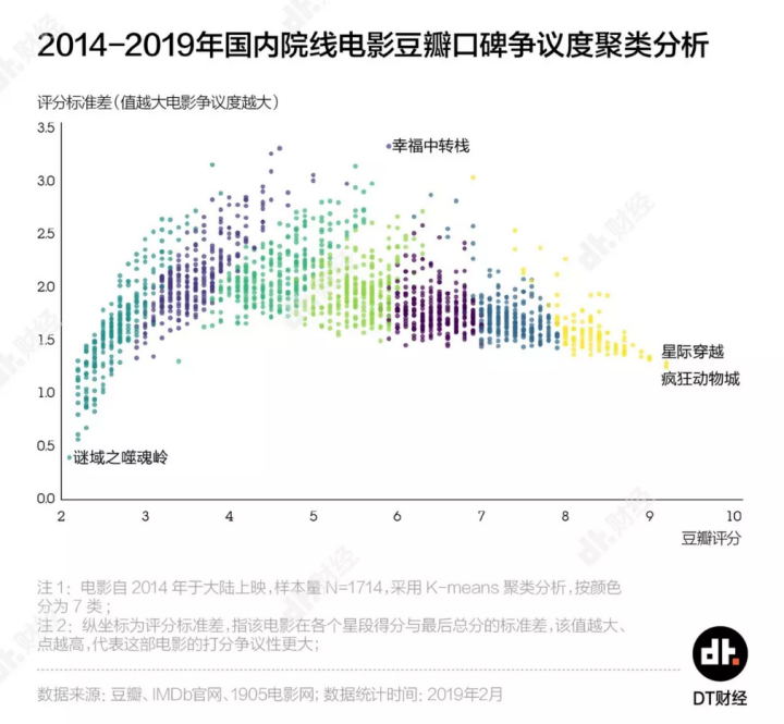 根据每部电影的豆瓣评分与评分标准差,我们对1714部电影进行了聚类,表现相似的电影在下图中属于同一颜色。