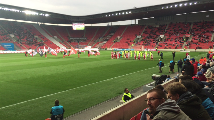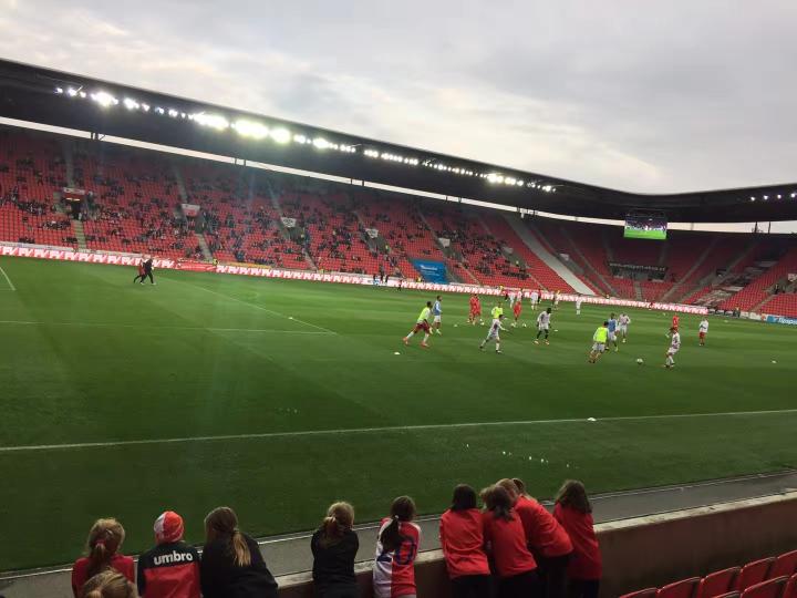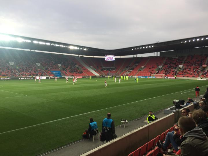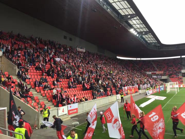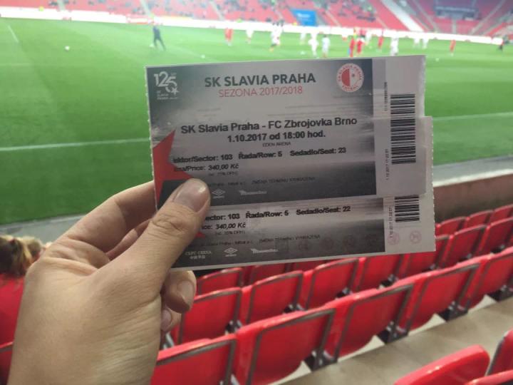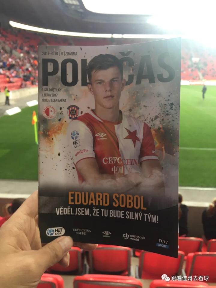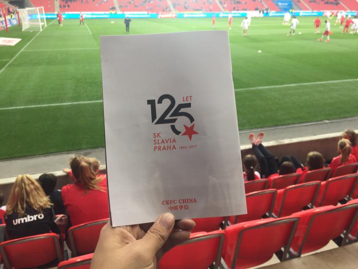 伊甸园球场位于布拉格新城区的东南部,距离老城区还是有一段距离,我们坐了好久的有轨电车开赛前赶到了球场;在球场售票处现场买了球票,一等座340克朗一张约合100元人民币;在伊甸园球场内外到处都能感受到祖国的伟大力量,球场的主要通道标识、球队宣传册、球队队服上随处可见“中国华信”四个硕大的汉字;和昨天的杜克拉小球场相比,伊甸园球场确实高大上了很多,绝对一流的专业化球场,各种设施和视野都特别好;死忠球迷们也收敛了很多,大炮仗是带不进来了,只能扔点小烟花;见惯了大场面的捷克警察叔叔们也是早有准备,小烟花扔下来我就拿个早就准备好的水桶给你盖上就安全了;于是舒舒服服的在伊甸园球场看了场球,这场对联赛垫底的弱旅布尔诺的比赛上座率大概有50%,一家三口一起来看球的小朋友们也是不少。