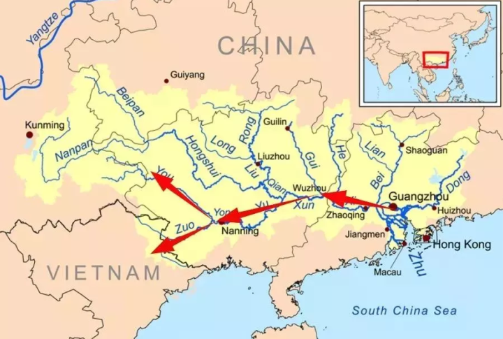 ▲广东商人沿西江西进示意图,最远能到达广西与云南、越南的边境地区。现在的西江沿岸仍然分布着大大小小的粤语城市和集镇。