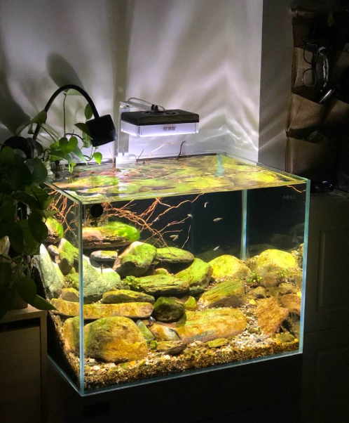 如果想要还原溪流的状态,还要增加造浪泵,在缸底放上沙子并叠上层次不齐的鹅卵石,帮一些小型鱼制造躲避空间。