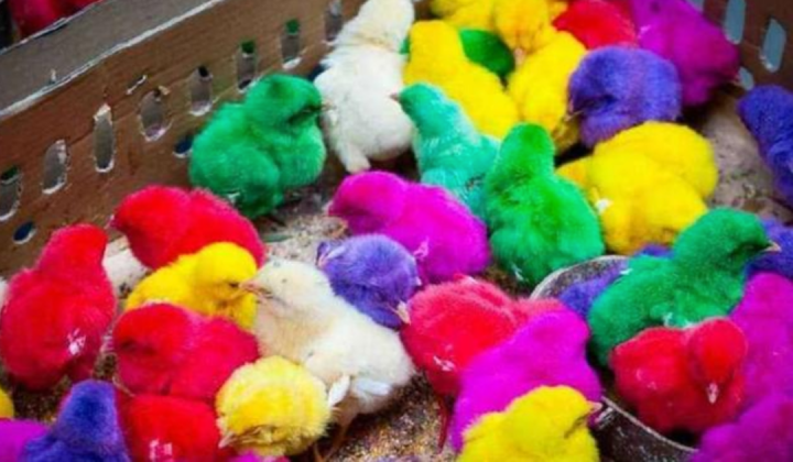 不知道为啥,这让我忽然起来小时候学校门口被小摊贩摆在纸箱里卖的五彩鸭子。
