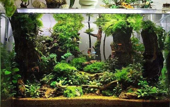 如果想要鱼缸里多一些绿色,还要学习水草养殖,研究阴性水草和阳性水草,并且给不同的水草搭配合适的造景,打氧、配置LED灯模仿阳光光谱、配置二氧化碳生成器帮助水草进行光合作用。