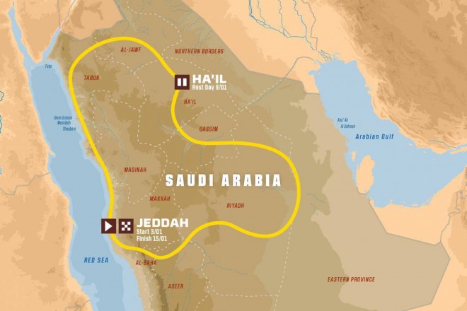 路线图由达喀尔拉力赛的组织者Amaury Sport Organization(ASO)发布。比赛将于2021年1月3日从吉达(Jedda)开始,1月9日于哈伊勒市(Ha'il)暂停一天,之后1月15日在吉达结束。