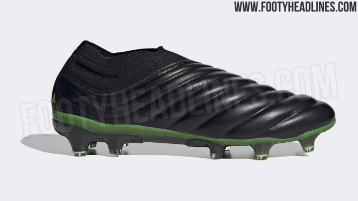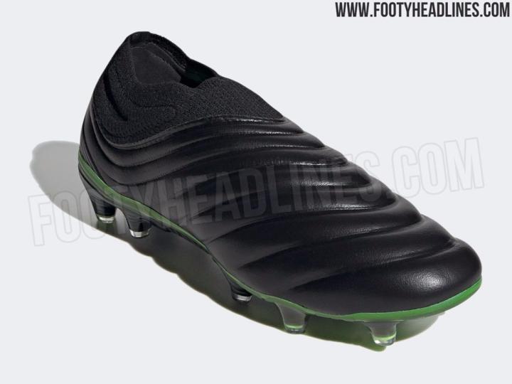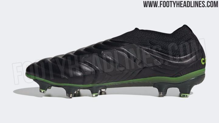 新配色Copa 20+足球鞋的鞋面被纯黑色所包围,展现出其所使用的无走线袋鼠皮鞋面拥有的迷人光泽和质感。虽然鞋面看起来是如此低调内敛,不过这双新配色Copa 20+的大底看看起来要比鞋面高调了不少,信号绿配色的大底以及加入亮绿色妆点的鞋钉为其增色不少。
