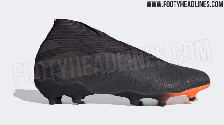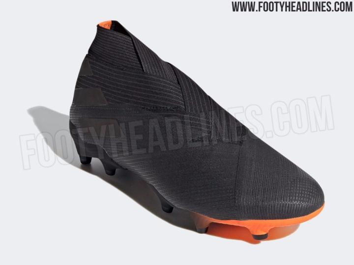 同时曝光的该套装中的Nemeziz 19+足球鞋采用了与Copa 20+相似的色彩搭配,标志性的针织鞋面被黑色所包围,而球鞋内衬与大底上的信号橙色在黑色鞋面的衬托下更显醒目。值得留意的是,新套装中的Nemezizi 19+战靴的大底还采用了由黑至橙的渐变效果处理。