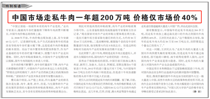 2013年时,《中国贸易报》就报道说,国内牛肉市场上每年走私牛肉高达200多万吨。