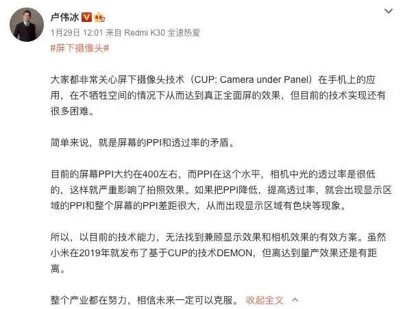 今年 1 月,小米副总裁卢伟冰也指出,以目前的技术能力,还很难找到兼顾显示效果和相机效果的有效屏下方案,距离量产也仍有距离。