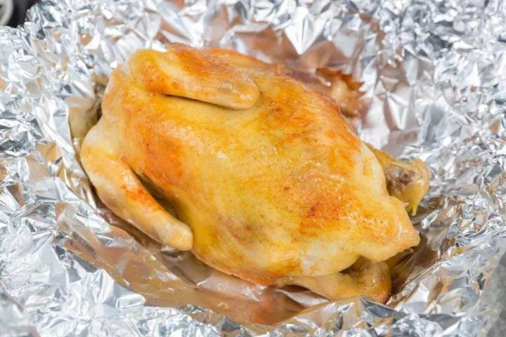 别忘了给鸡来一个全身按摩,内外涂抹精盐,在覆盖上一层锡箔纸包得严严实实。