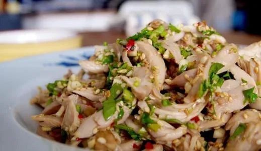 盐、芝麻、鸡精等调味的渲染下,鸡肉的味道和调料融为一体。