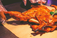 选中1-1.2公斤大小的本地三黄鸡或矮脚黄嫩母鸡,第一次抹擦香料烘烤3至5分钟,冷却后再抹香料油炸一次;