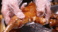 带上手套,轻轻掰下一只小腿,连肉带皮溢出鸡汁。