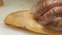 然后用手指,一片一片撕开鸡身的各个部位,最后把鸡肉条扔进调味盘。
