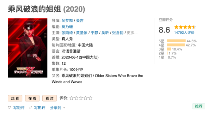 截至 6 月 13 日 0:00,刚刚上线 12 小时的《乘风破浪的姐姐》已经获得了 1.4 亿的播放量,豆瓣分数在 14000+ 个观众中有 44.5% 观众 5 分评价的帮助下,把评分稳到了 8.6 分。