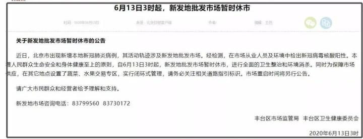 6月13日3时,新发地批发市场暂停休市,并进行全面的卫生整治和环境消杀。
