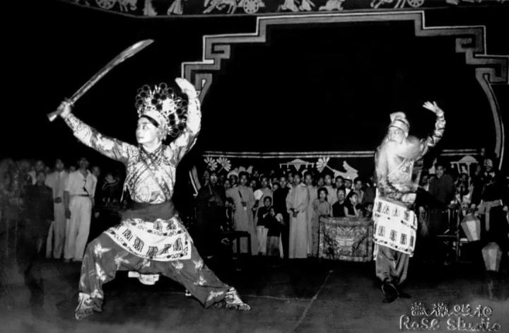 我们有一张两人在建国前同台合作的照片,演出环境很奇怪,不在剧场里,大家都站得很拥挤地看戏,但没有任何文字说明的信息。我一直苦于在想这张照片背后到底是什么故事。有一天在网上查别人的信息的时候,突然看到上世纪四十年代上海滩一个公子哥的日记里的一句话,说他今天去看了一场义务戏,《大溪皇庄》,是麒派的周信芳和盖老板合作的,这一下子就对上了。