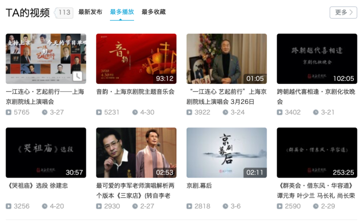 上海京剧院的b站账号页面,有老视频也有直播,上面有很多戏迷的弹幕。图截自网络。