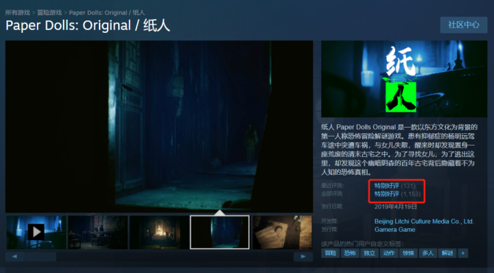 《纸人》在steam上评价为“特别好评”/图截自steam