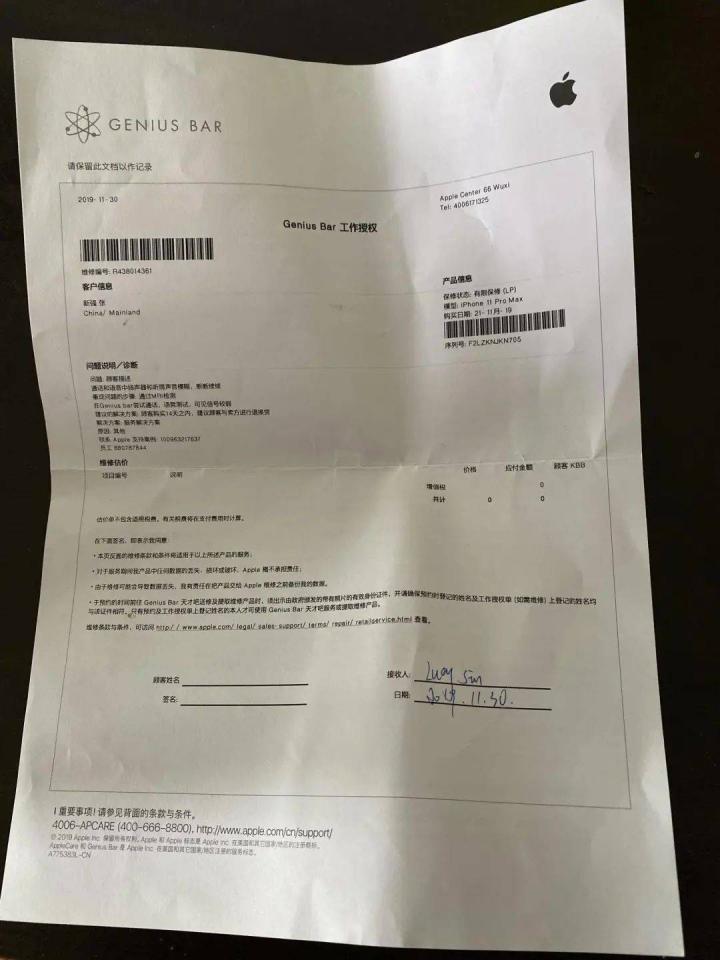 用户张牧于2019年11月19日在拼多多百亿补贴活动买了一部iPhone 11 Pro Max 256G版。收到货使用几天后,他发现通讯有问题,不论是通话还是微信语音,声音断断续续,遂联系商家。商家建议他出具检测报告,称如检测出质量问题,将进行处理。