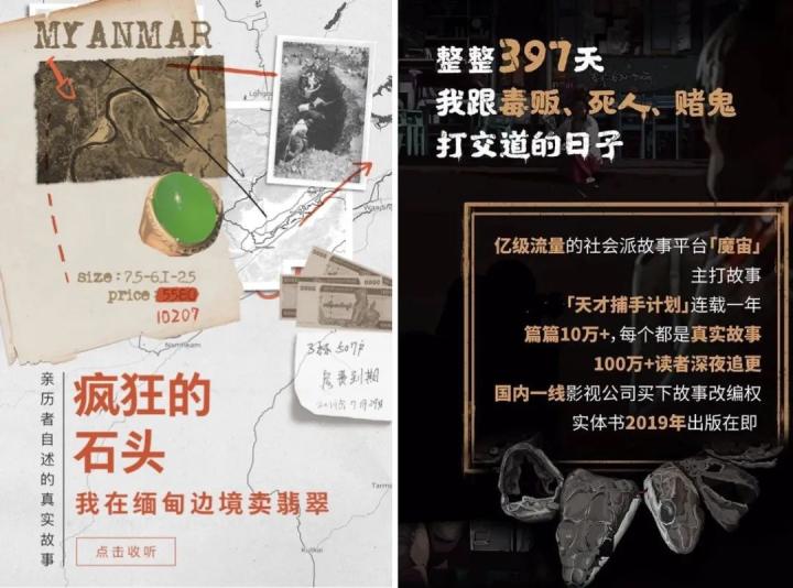国内的叙事类播客也在近年涌现,例如,大象公会旗下讲述普通人故事的播客《故事FM》,魔宙基于悬疑故事文章推出的衍生音频内容,看理想App与箭厂合作出品的《边境故事:瑞丽的机会》。