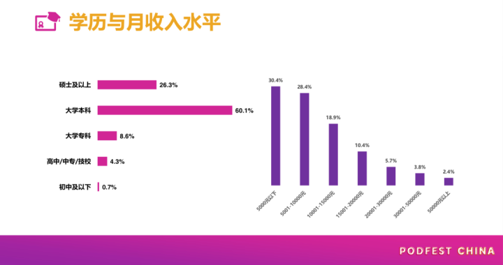 以“雪花牛里的脂肪”的脂肪类比播客听众,说明这是一群低调且质优的用户。根据PodFest China发布的《2020中文播客听众与消费调研》,中文播客用户主力来自一线和新一线城市,且近九成用户学历在本科以上。