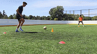 第三个训练是反向传球,场地设置和第二个训练几乎一样,这次我们改变了传球技巧,我们依然是有方向的触球穿过身体从一侧到另一侧,但是传球技巧是反向传球。给大家演示一下,还是将球踢回。