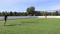 第一个训练是两脚触球方格训练,我们摆放出两个3*3的方形区域,间隔15~20码,我们要做的是将球传进队友小区域,队友一脚接球,第二脚将球传回。
