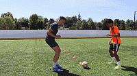 我们要尝试尽可能在两脚之内完成这个训练,我们要在运动中控球,第一个训练是先将球停住,这一次我们是将球接向下一步的方向,这个技巧在防守队员压迫时非常有用,我们可以用第一脚触球将他们摆脱,为自己的下一个动作创造出空间,确保两个方向都练,能够双脚进行传控。